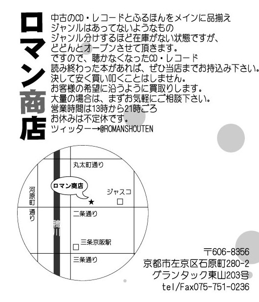 京都東山二条に現れた愛のリサイクル屋「ロマン商店」所属。ふるほん&中古レコード&CD売ってます。 京都市左京区石原町280-2グランタック東山二条203号 買取もしてます。お気軽にご連絡下さい 電話075-751-0236
