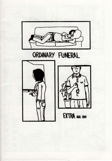 大阪で出している冊子『ORDINARYFUNERAL』は、アメリカのオルタナティブ・コミックスの影響を受けた絵で、日常の心象を綴るマンガ作品集だ。現在6号まで制作。今回のイベントでは、今までの冊子の中から5編を選び再録したEXTRAを販売予定。二日酔いの朝、同人誌サークルの青年、競馬好きの童貞中年、周りの世界に置いて行かれてく様な夫婦など、静かな余韻と悲しさの残るストーリーです。